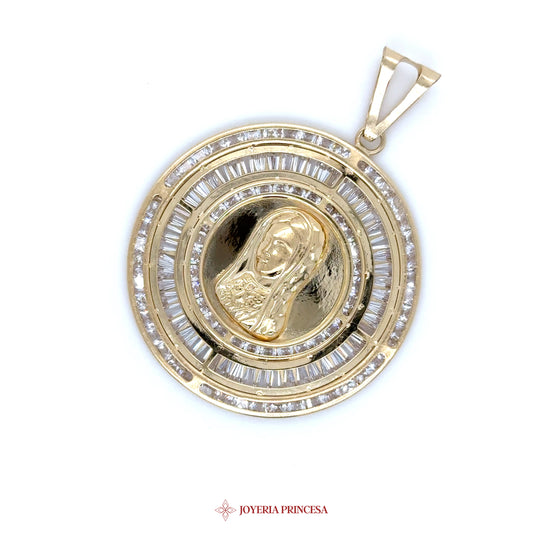 10K Gold Virgen De Guadalupe Pendant with Round Baguette Design