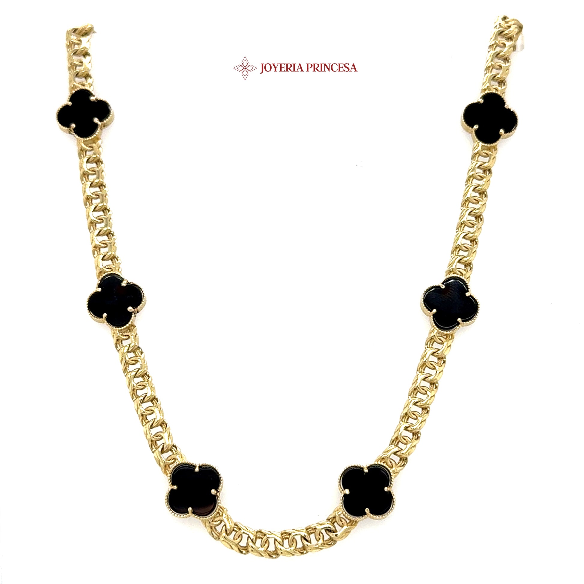 Luxurious gold chain adorned with alternating black clover motifs, exuding sophistication and charm, perfect for elevating any ensemble with its distinctive elegance.