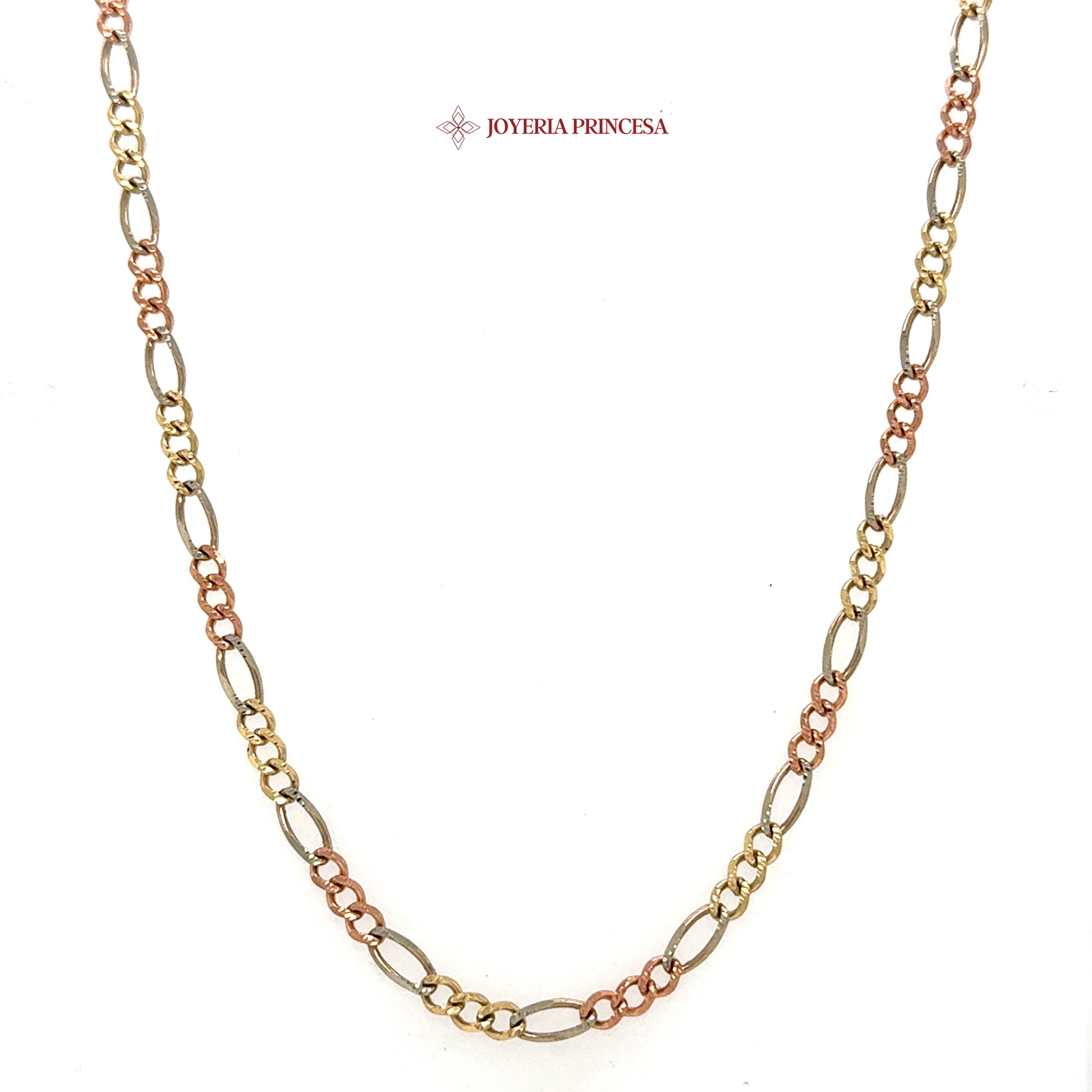 This exquisite Three-Tone Figaro Chainfeatures alternating rose and yellow links, creating a harmonious and modern design that enhances any ensemble with refined elegance.