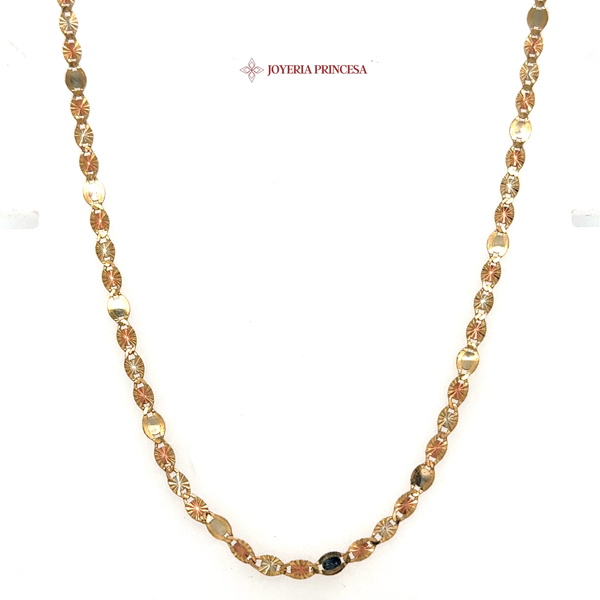 This exquisite Star Valentino Necklace features a stunning interplay of shiny gold and rose gold links, enhanced by intricate diamond-cut detailing for captivating brilliance.