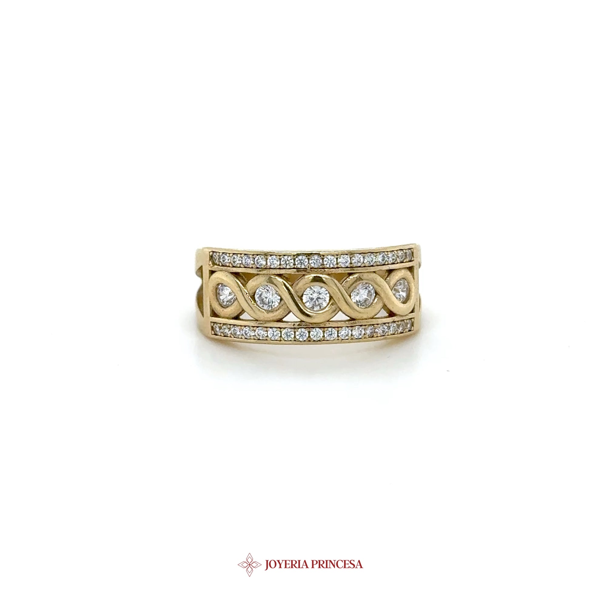ES: Celebra la elegancia con este impresionante anillo de diseño infinito en oro amarillo de 10K. • Presenta brillantes piedras de circonita cúbica • Motivo infinito único • Perfecto para el uso diario o ocasiones especiales