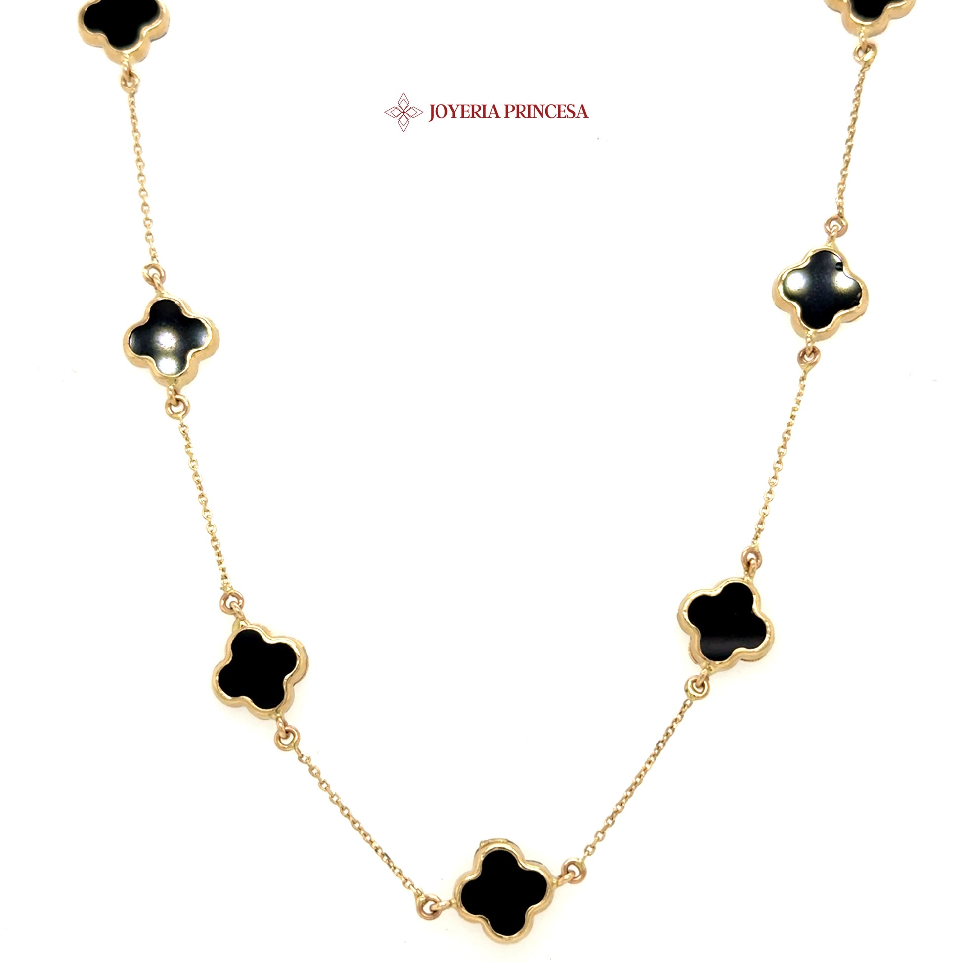 This exquisite necklace showcases alternating black clover motifs, elegantly framed in gold, creating a striking contrast that ensures a luxurious appeal for any occasion.