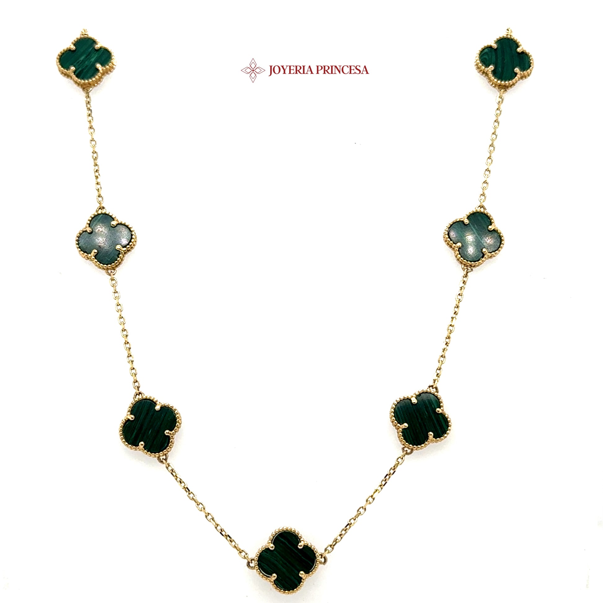 Adorned with rich green clover motifs, this stunning necklace showcases intricate detailing and delicately linked chains for a luxurious appeal.