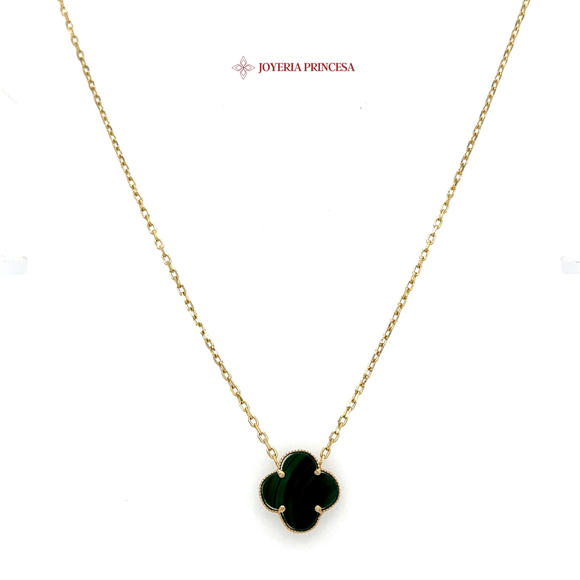 A stunning gold cable chain necklace featuring a striking green malachite clover pendant, showcasing intricate detailing for a sophisticated look.