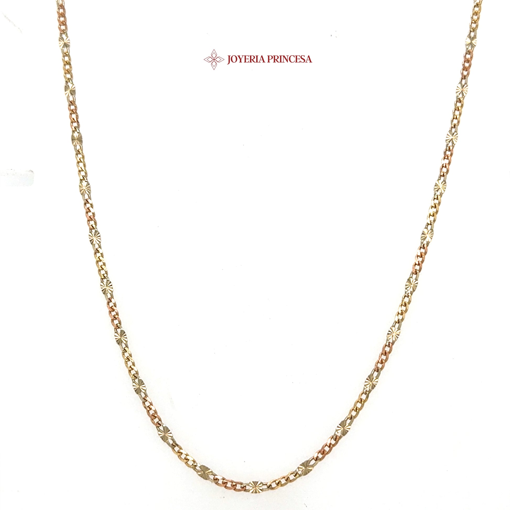 Experience the elegant simplicity of this 14K 3 Color Valentino Figaro, perfect for layering or as a standalone statement piece that enhances any style effortlessly. - Intricate link design - High polish finish - Premium 14K gold