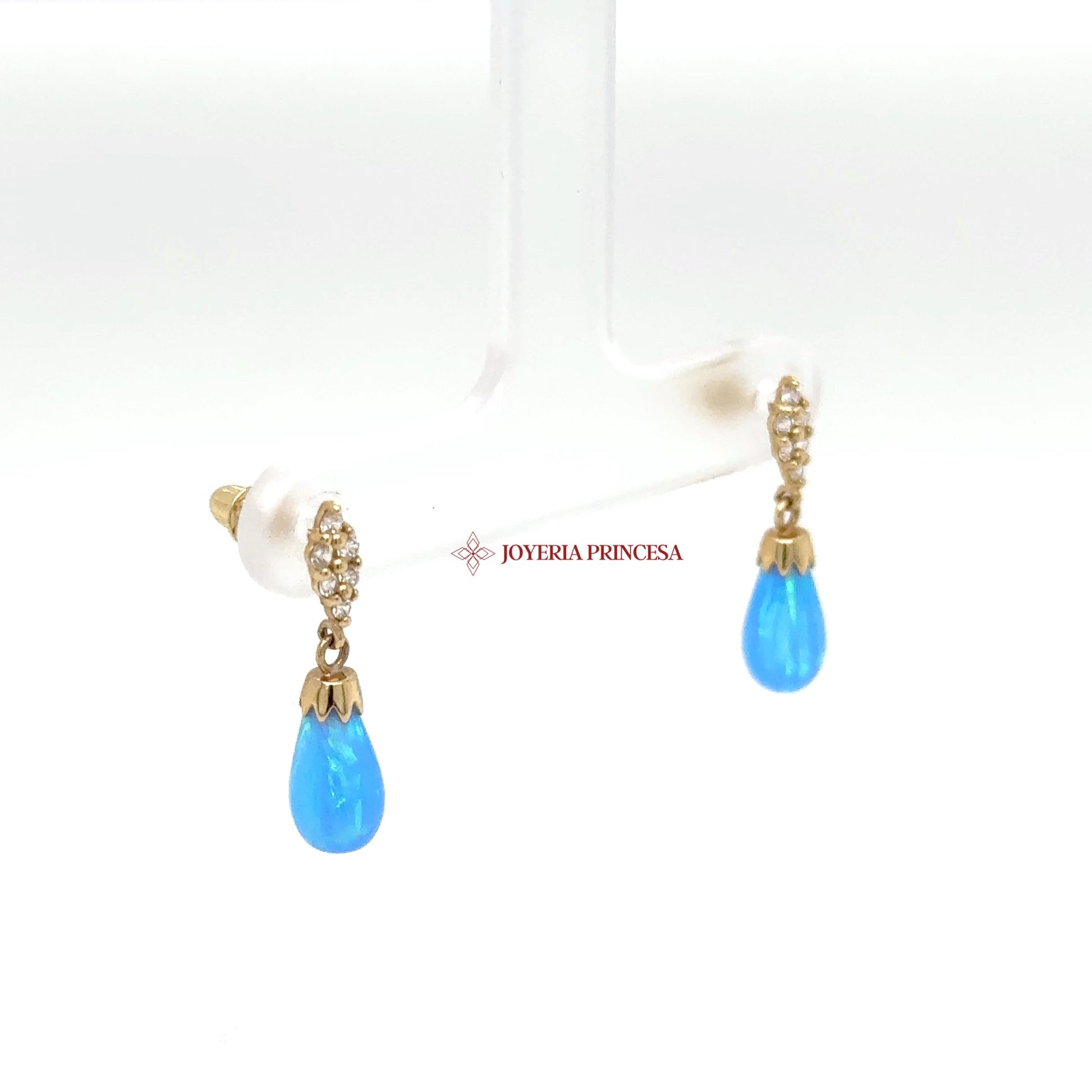 Elegant 14K gold earrings featuring teardrop blue opal stones with sparkling accents.