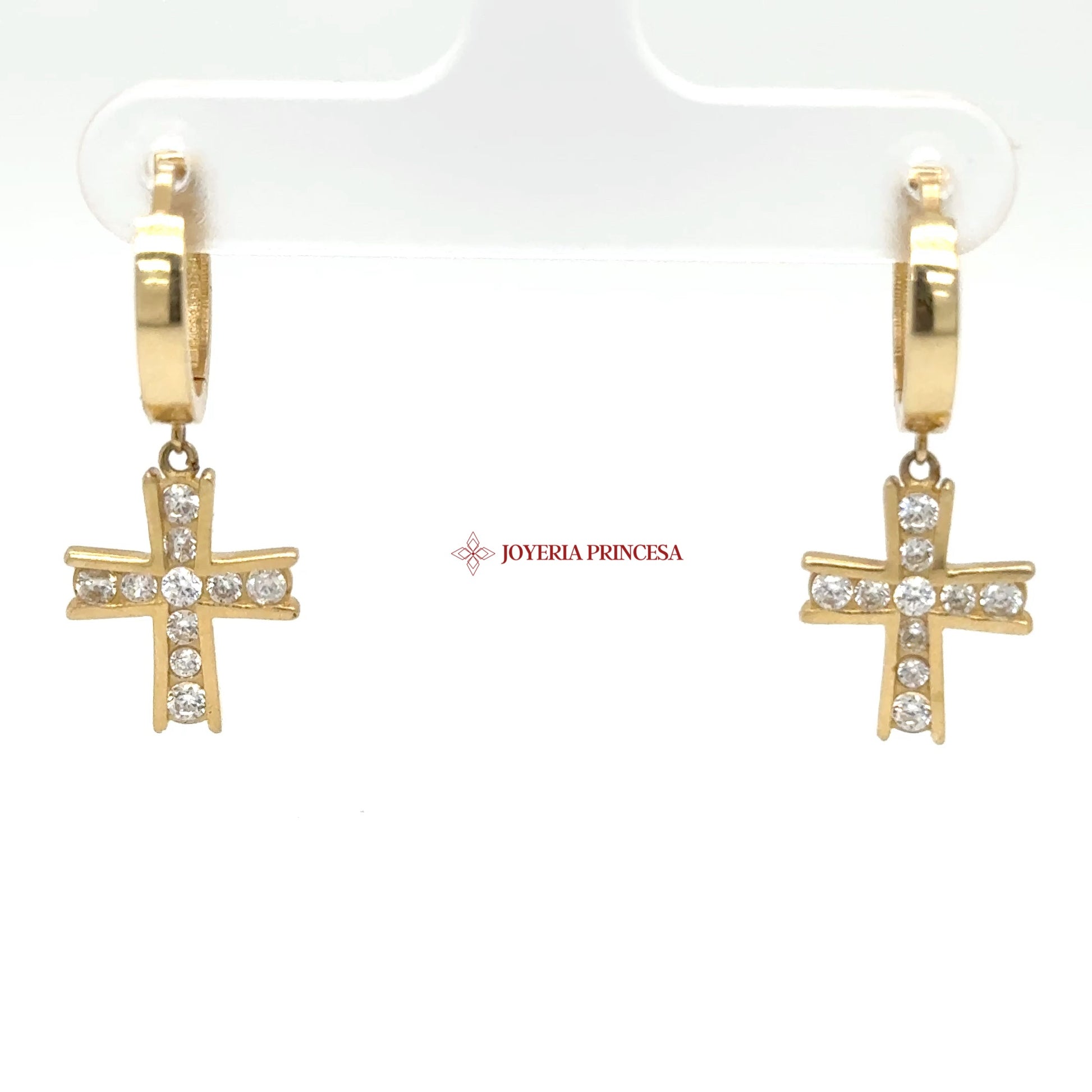 EN: These elegant 14K gold dangle earrings feature a cross design adorned with sparkling cubic zirconias.