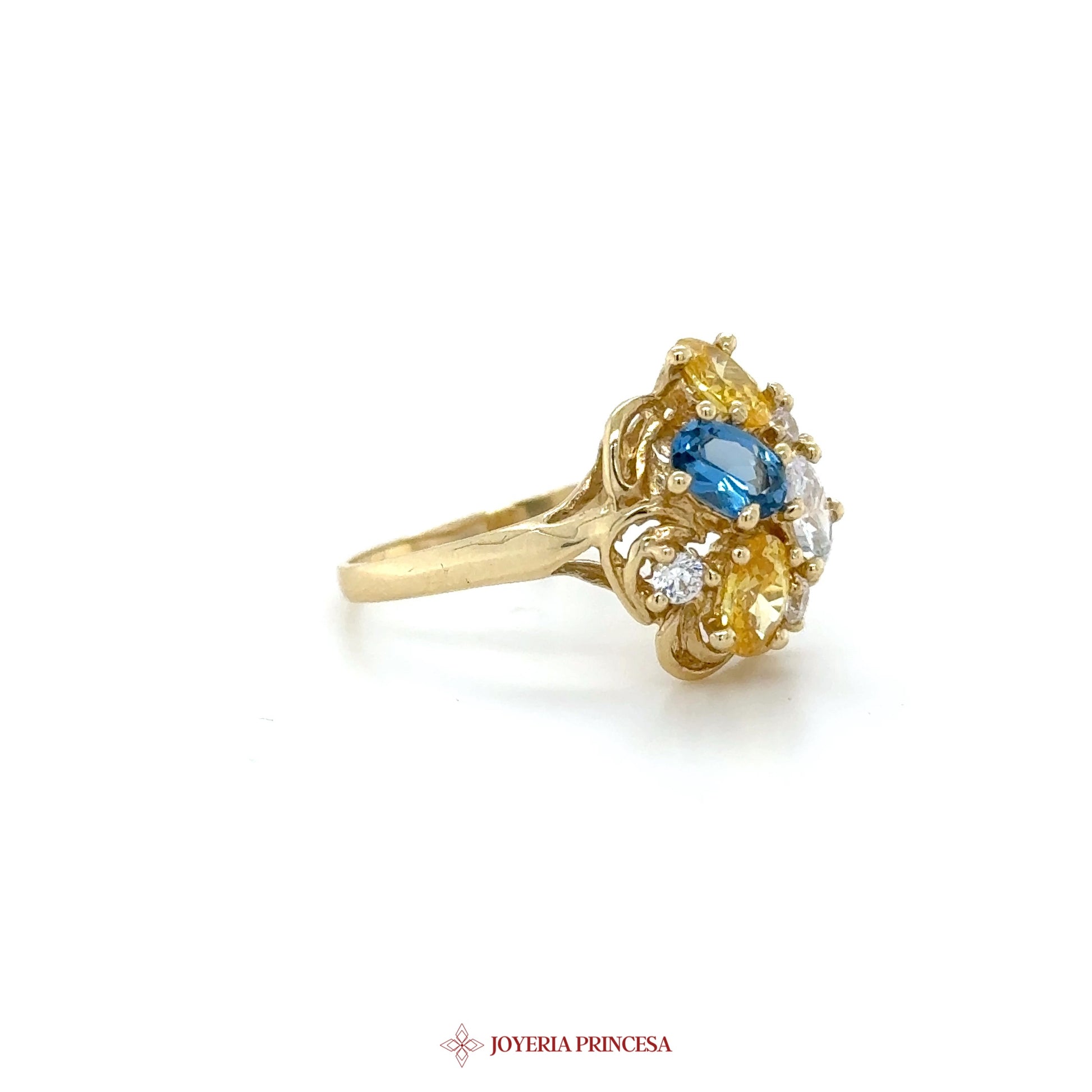 14K Gold Floral Design Ring with Blue and Yellow Stones