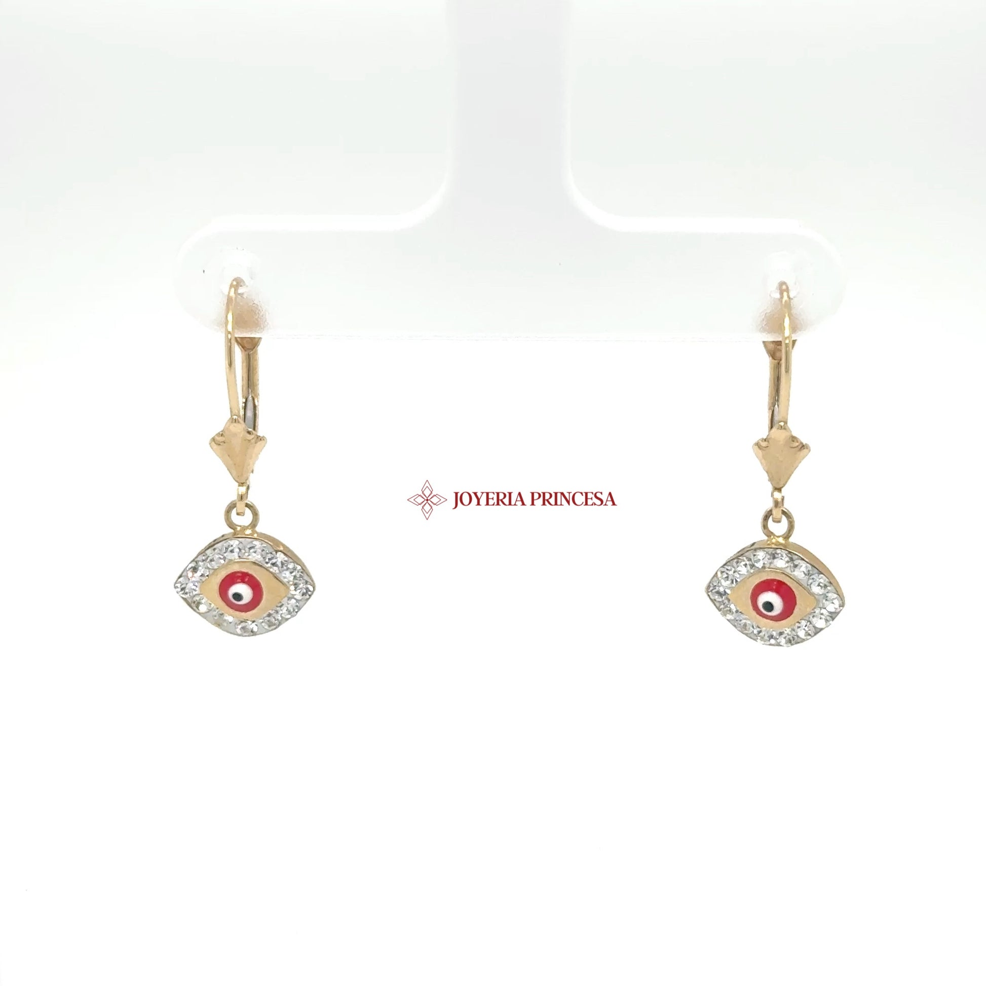 EN: These stunning 14K gold huggie earrings feature an enchanting evil eye motif adorned with sparkling cubic zirconias.