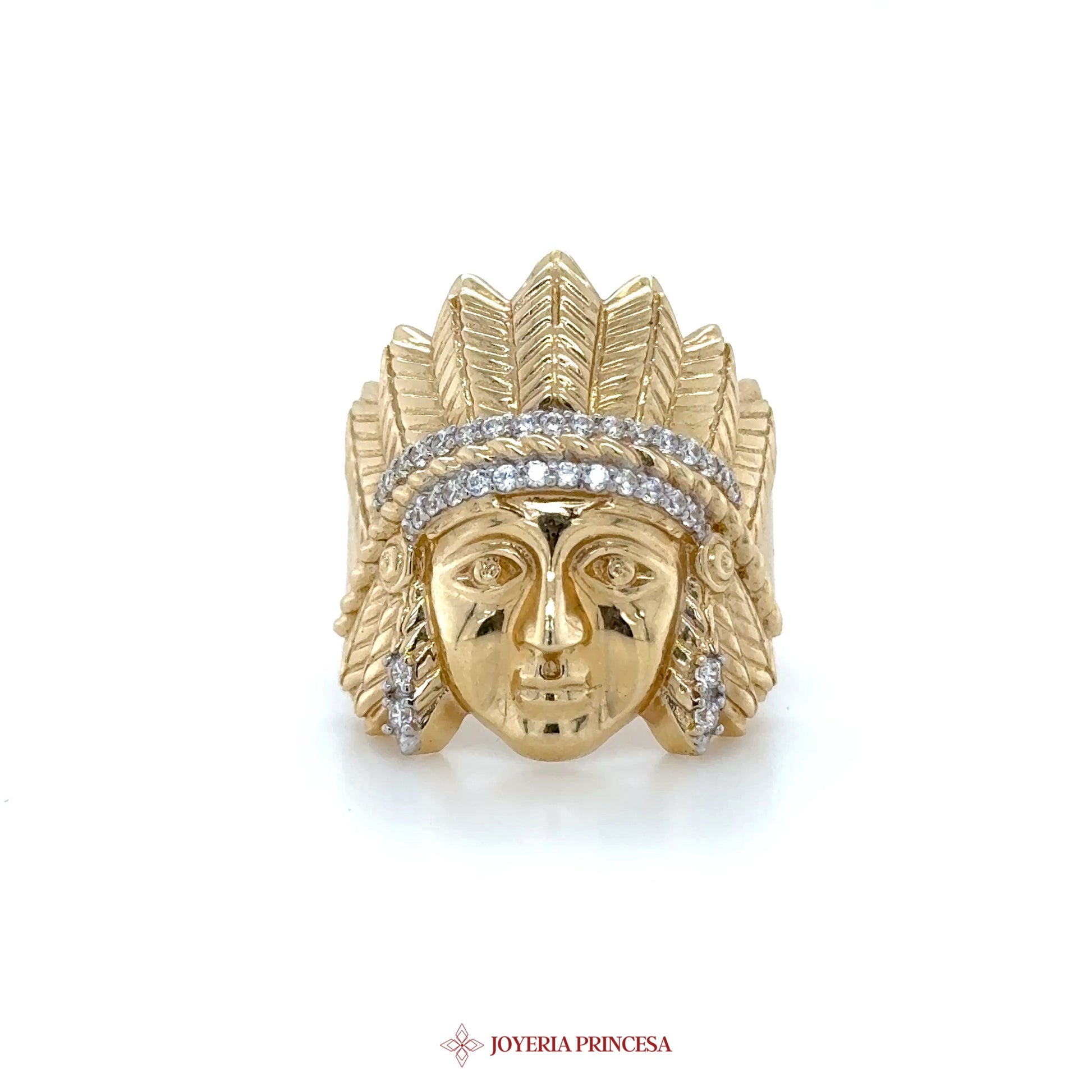 EN: Embrace a bold statement with this 14K gold Indian chief ring featuring simulated diamonds. • Intricate feather detailing • Unique cultural motif • Perfect for any occasion