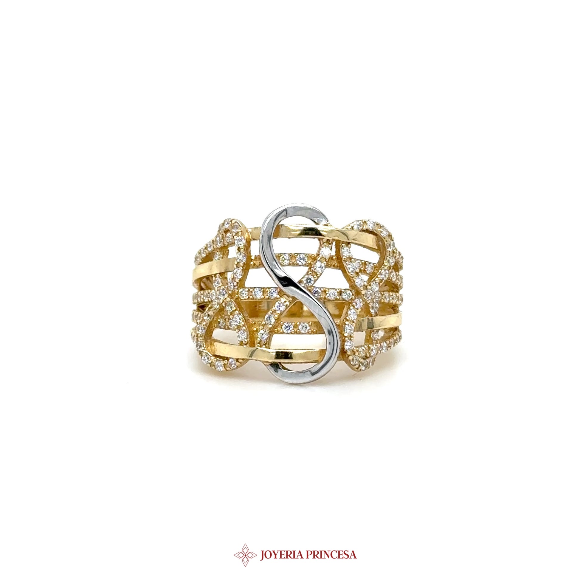 ES: Este impresionante anillo de oro de 14K presenta un elegante motivo de infinito adornado con brillantes diamantes simulados. • Diseño único • Perfecto para cualquier ocasión • Ajuste cómodo