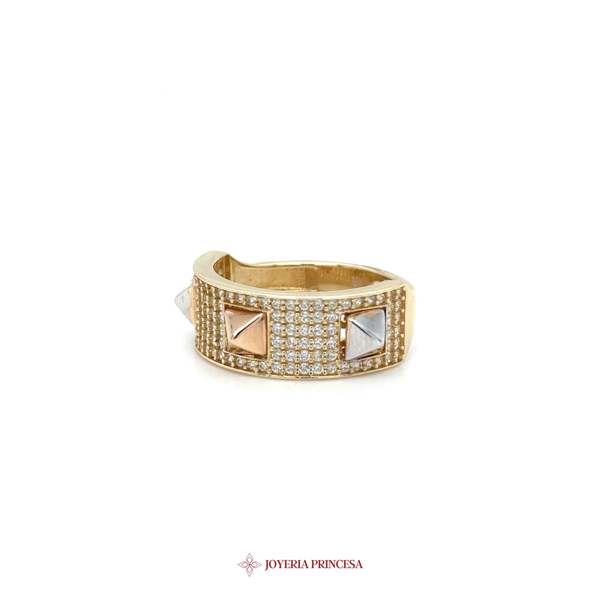 EN: This stunning 14K gold band features sparkling CZ stones and a rose gold accent for a modern touch. • Crafted in luxurious 14K gold • Features shimmering CZ stones • Unique design with rose gold details