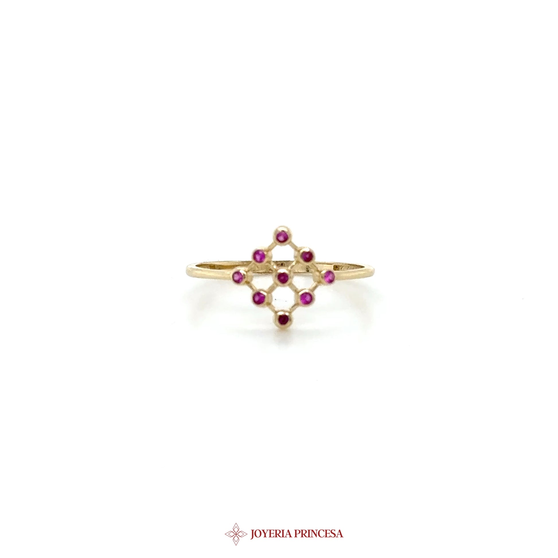 ES: Este anillo de oro de 14K presenta un impresionante grupo de rubíes simulados, perfecto para cualquier ocasión. • Diseño elegante • Ajuste cómodo • Opción de regalo ideal