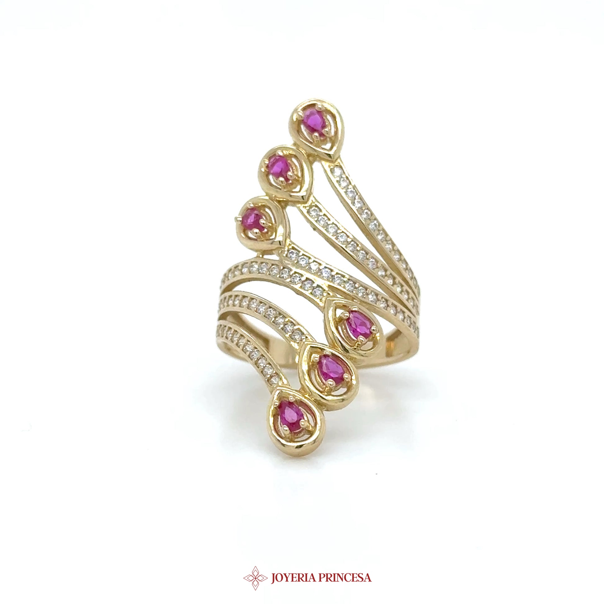 EN: This elegant 14K gold spiral ring features vibrant pink stones and sparkling accents. • Stunning design with five pink stones • Crafted in warm 14K gold • Perfect for any occasion