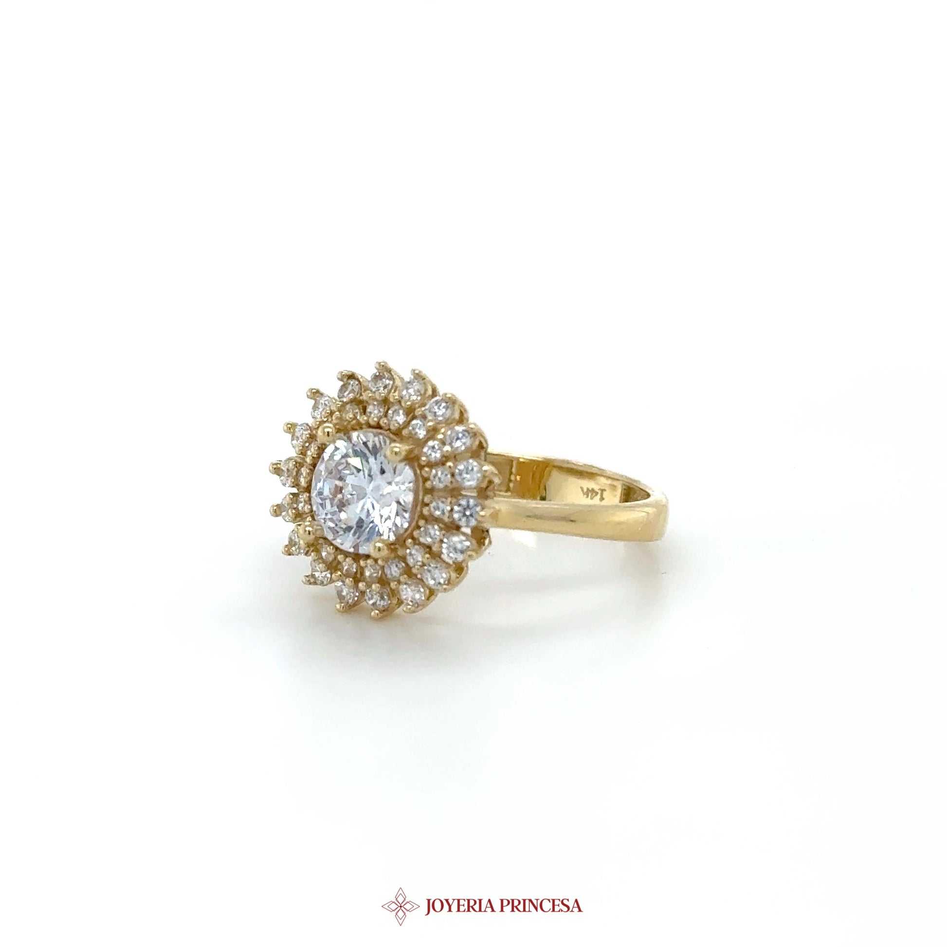 EN: This stunning 14K gold sunburst halo ring features a brilliant center stone surrounded by shimmering CZ accents. • Elegant sunburst design • Crafted in 14K gold • Sparkling cubic zirconia stones