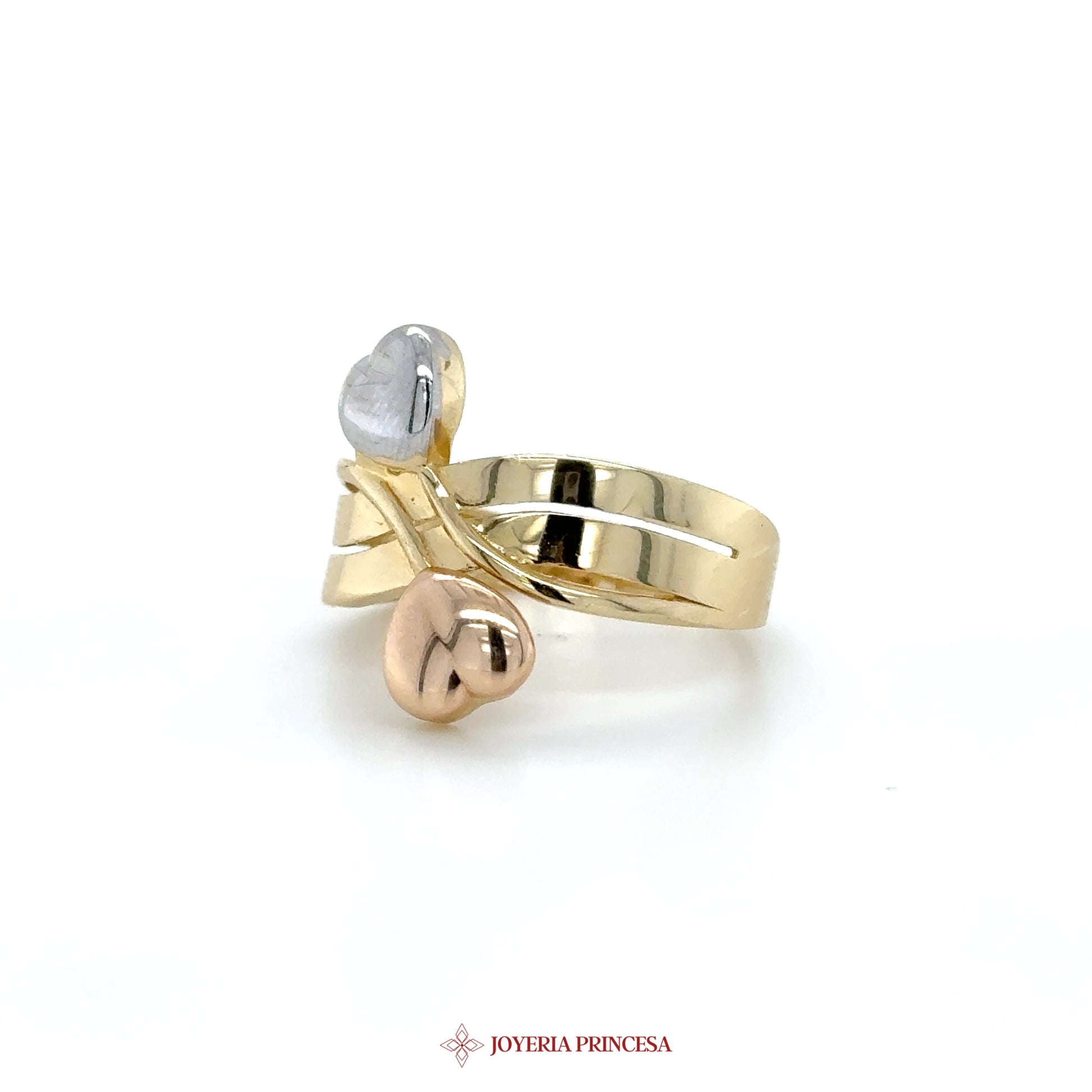ES: Este encantador anillo de 14K presenta corazones entrelazados en oro amarillo, blanco y rosa. • Diseño de corazón único • Oro de múltiples tonos para un look moderno • Perfecto para regalar