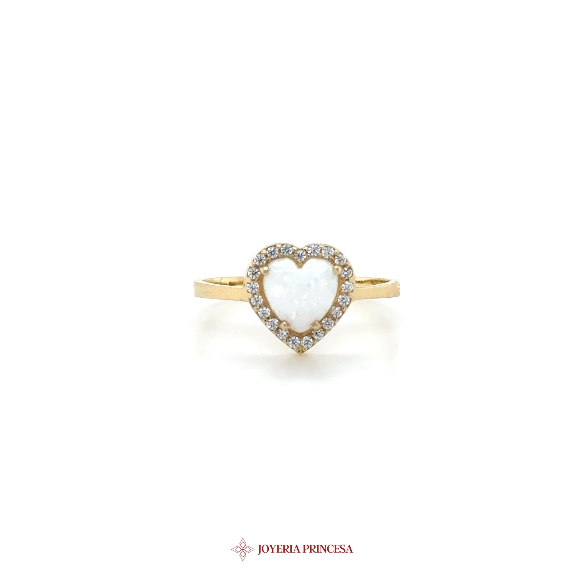 ES: Este encantador anillo en forma de corazón presenta un impresionante centro de piedra simulada rodeado de acentos brillantes. • Elaborado en oro de 14K • Motivo de corazón para un toque romántico • Perfecto para el uso diario o ocasiones especiales.
