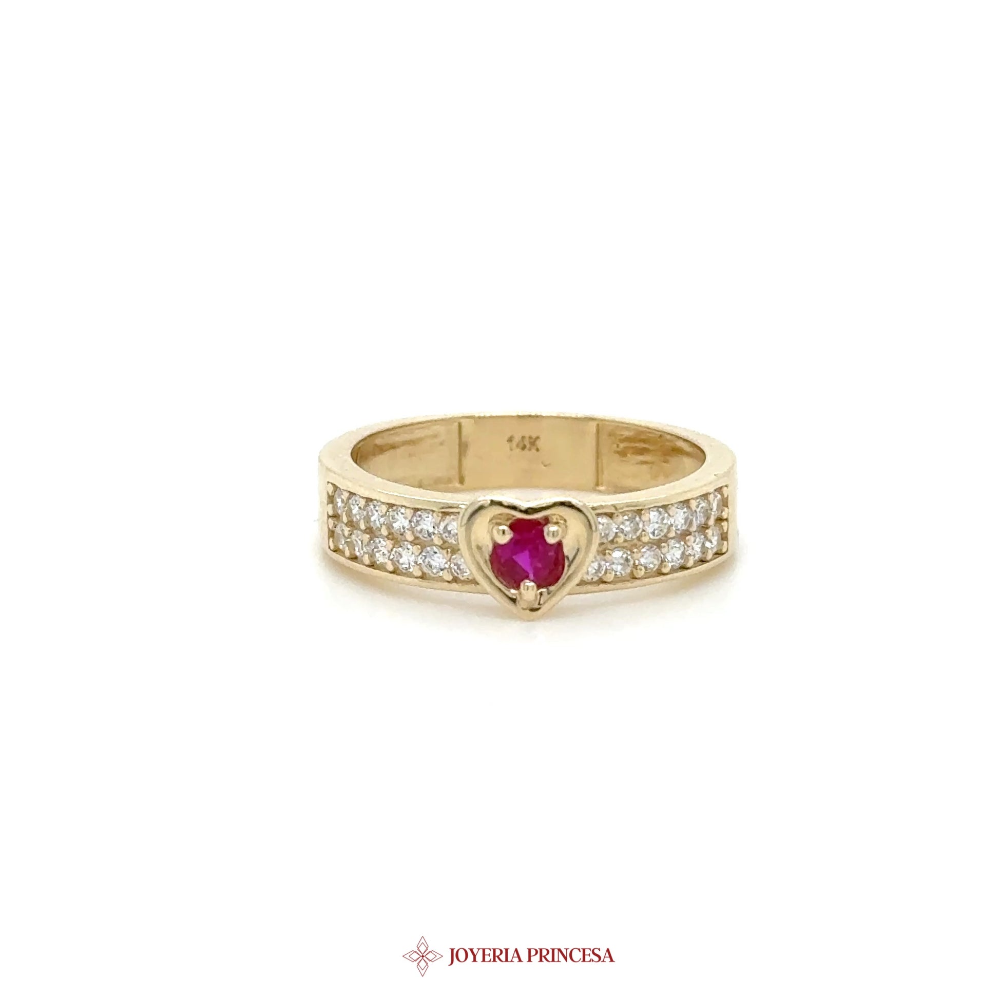 EN: This elegant 14K heart-shaped ruby ring is perfect for expressing love. • Features a stunning heart-shaped ruby centerpiece • Adorned with sparkling cubic zirconia accents • Crafted in warm 14K gold.