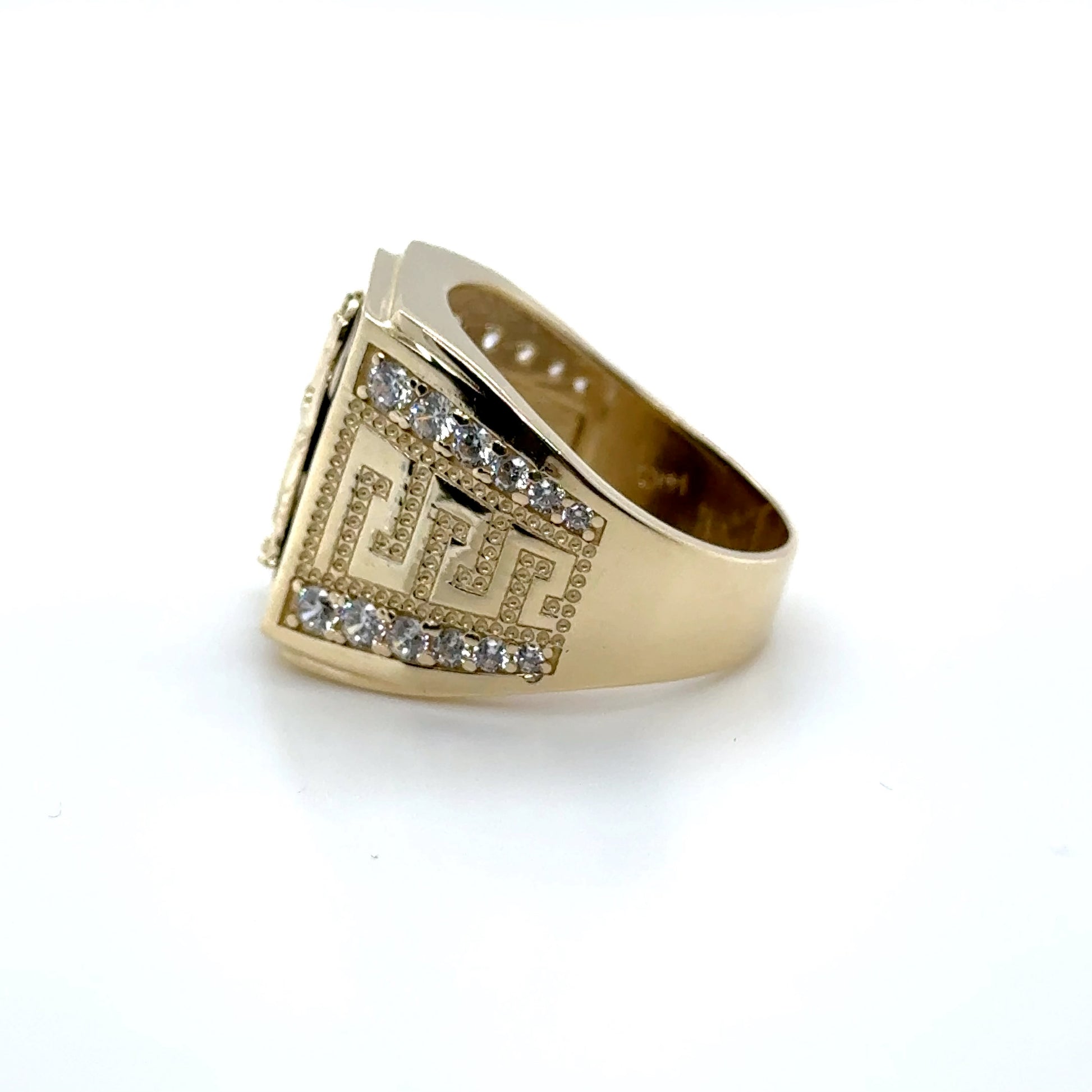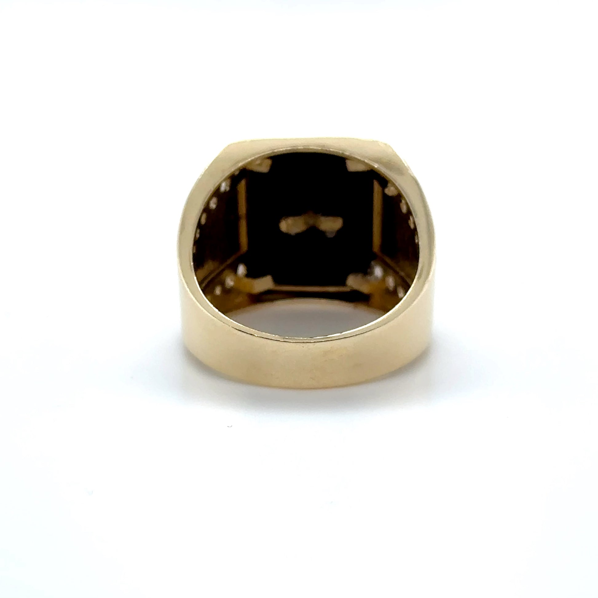 Elegant men's 14K gold ring with black onyx inlay features San Judas engraving and diamond-studded Greek key design. Key Features: