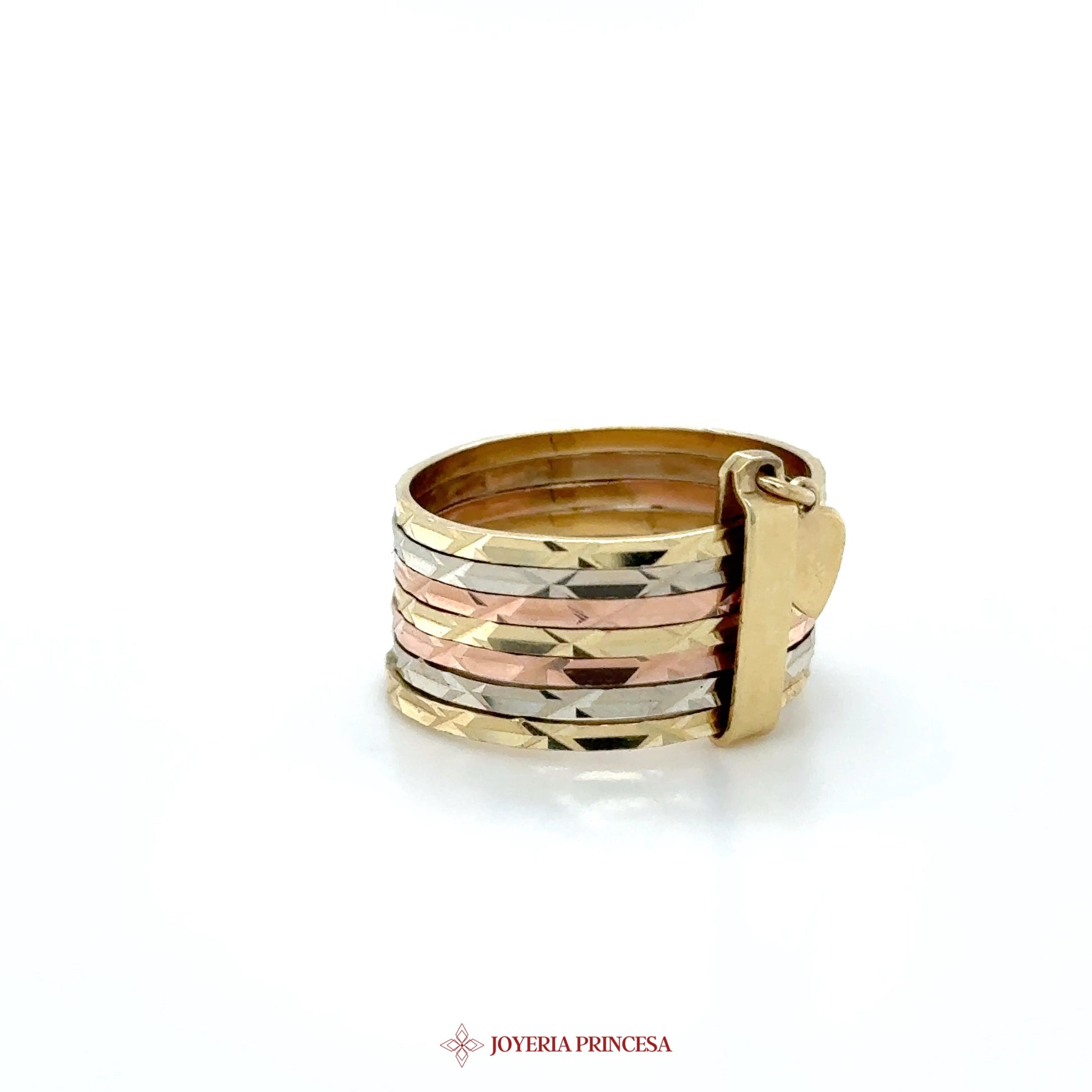 ES: Abraza la elegancia con este anillo apilado de 14K en tres colores con un encantador detalle de corazón. • Elaborado en oro amarillo, blanco y rosa de 14K • Diseño en capas único que añade profundidad • Perfecto para uso diario o ocasiones especiales.