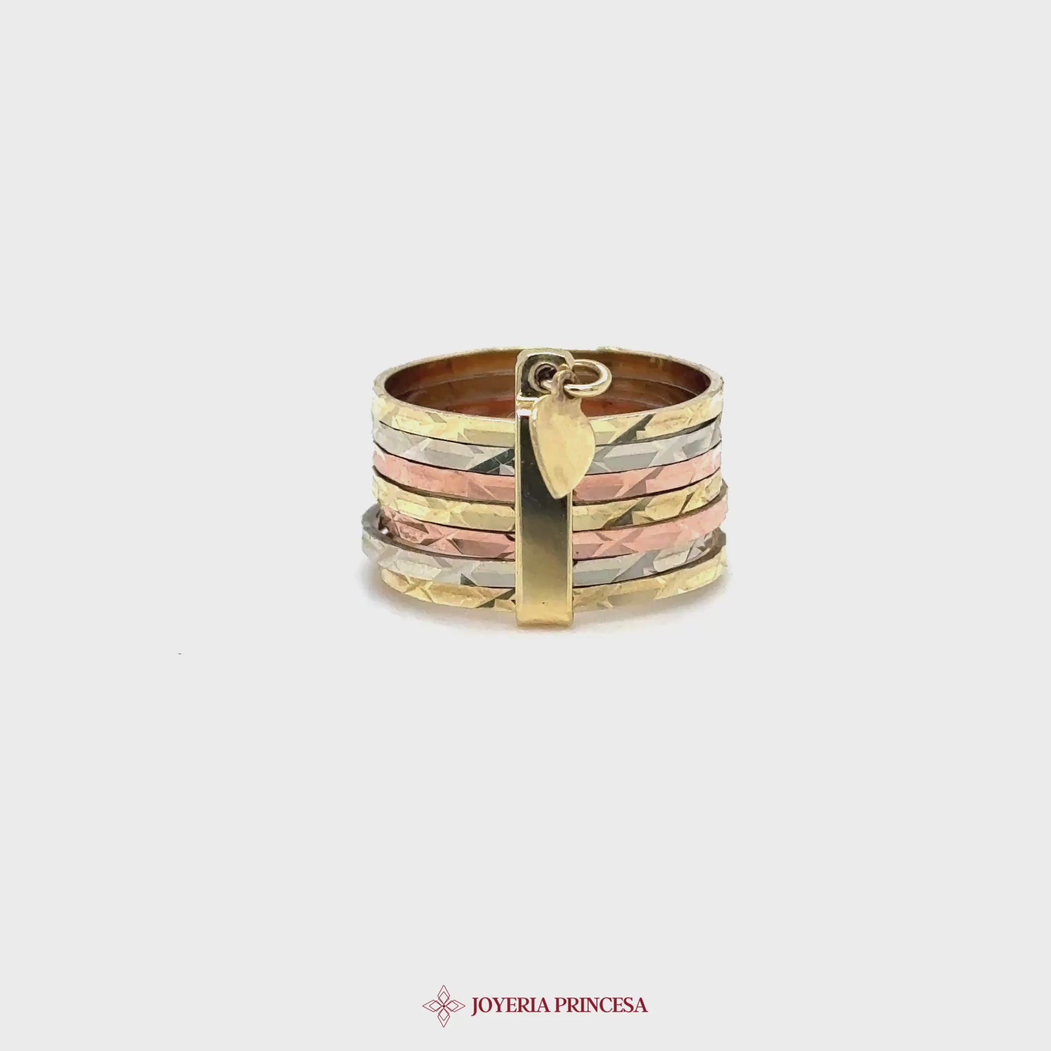 ES: Este impresionante anillo apilado de 14K presenta un diseño texturizado único. • Fabricado en oro de 14K • Diseño tricolor llamativo • Ajuste cómodo para el uso diario