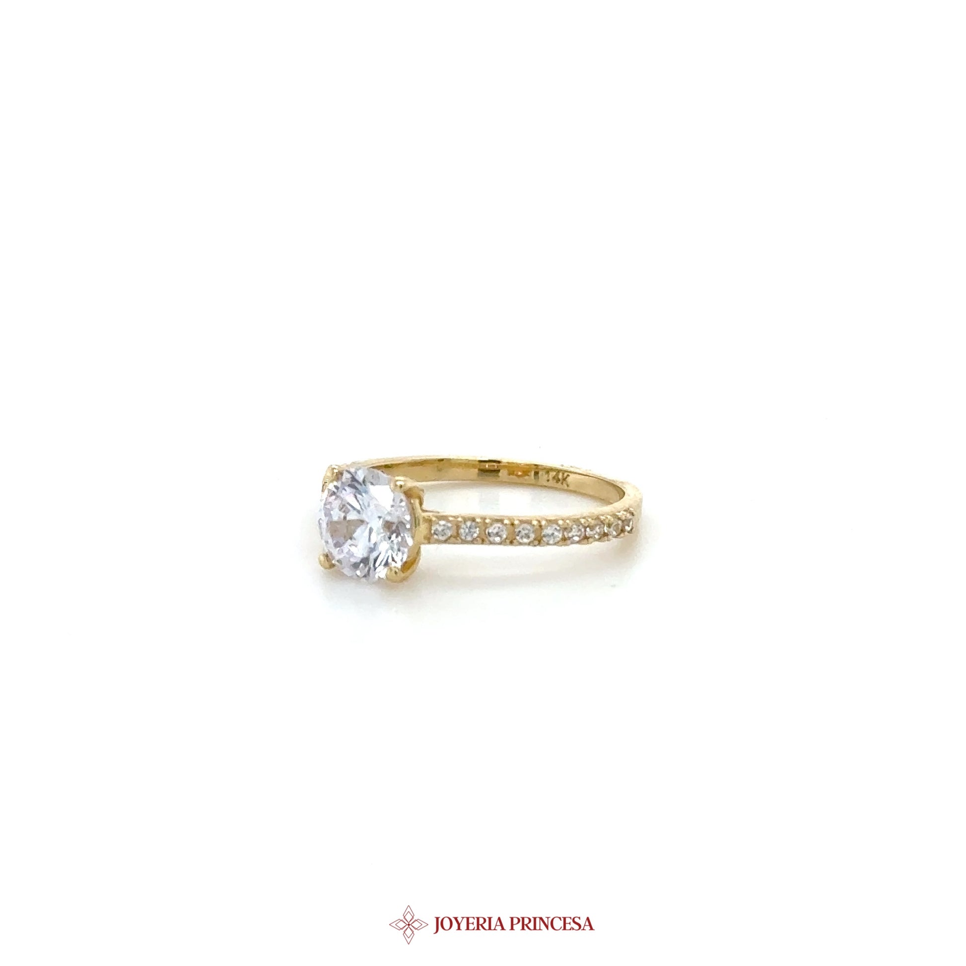 ES: Un impresionante anillo de compromiso en oro amarillo de 14K con una brillante piedra central de CZ • Elegante diseño solitario • Acabados de CZ brillantes a lo largo de la banda • Perfecto para ese momento especial.